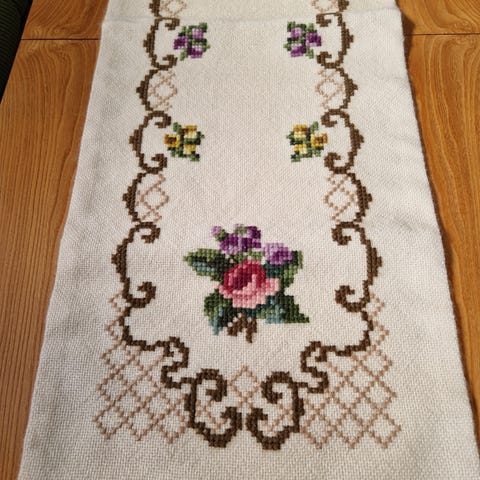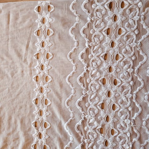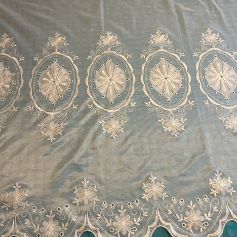 2 stk Gardinkappe i lys blålilla farge på hvit bunn. Brodert mønster. 2 forskjellige høyde og lengder. 1 stk L 137 H 26,5 cm. 1 stk L 200 H 43 cm. Lite brukt og fremstår som nye. Selger samlet. Sendes mot porto.