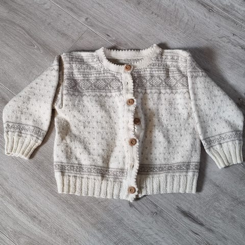 Strikkejakke i str 92. Strikket i tynn merinoull fra Sandnes garn. Mønster fra Klompelompe