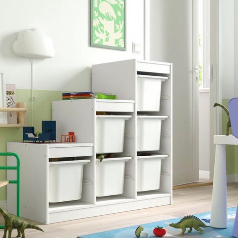 IKEA barnemøbel oppbevaringsenhet med hvite plastbokser