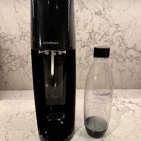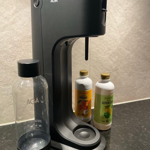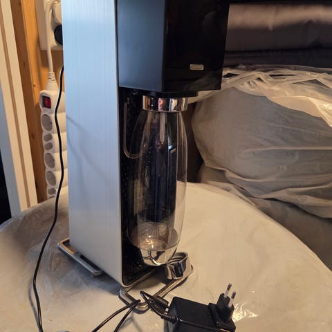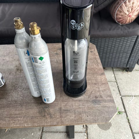 Pent brukt SodaStream kullsyremaskin selges sammen med 3 stk CO₂-sylindre (60 L).