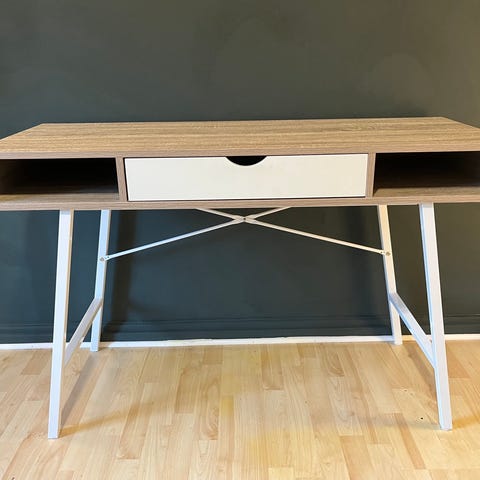 Bordplaten har et minimalistisk design med rene, rette linjer. Materialer inkluderer folie og stål, som er solide og slitesterke. FSC® Mix-sertifiserte materialer.