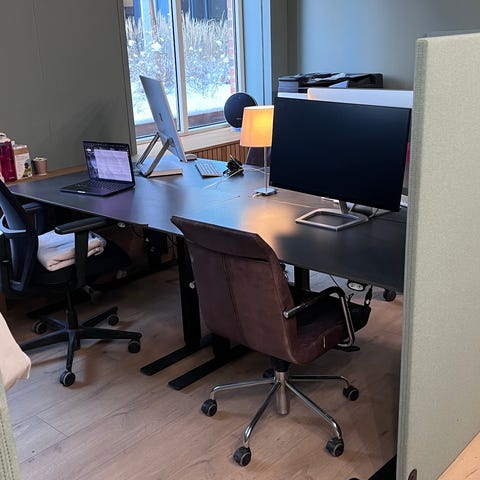 Pulten har gasslift for enkel og stille høydejustering mellom 64-108 cm. Fleksibel plassering med trådløst design og praktiske hjul for enkel flytting.