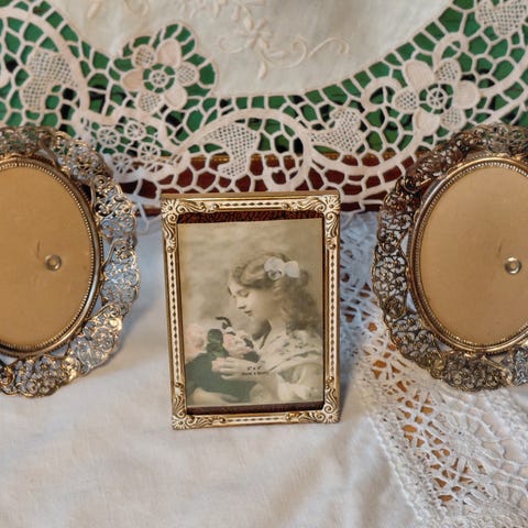 2 stk dekorative, vintage Jyden metallrammer med bakstøtte