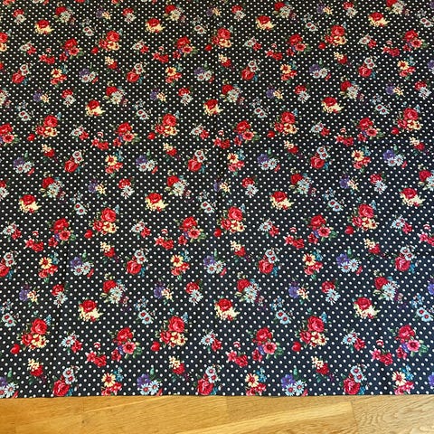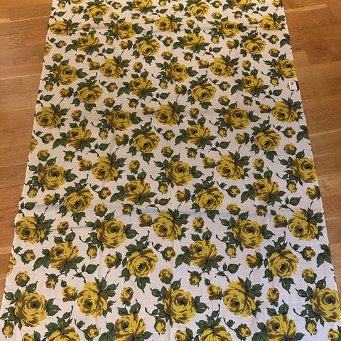 Bomullstoff med et flerfarget mønster med vertikale striper i gult, rosa, rødt, svart og hvitt, dekorert med blomster- og geometriske motiver. 60-70 tallet? Bredde 113 cm, lengde 354 cm.