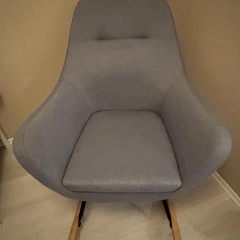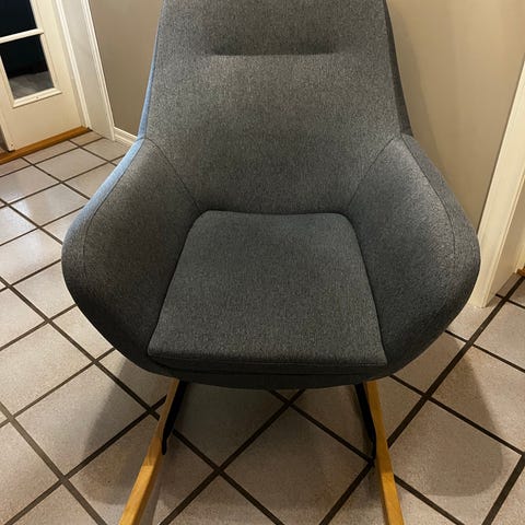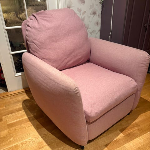 Stofftrekk. Setepute med pocket-fjærer og skumpolstring. Ryggpute i skum. Ramme i massivt tre og stål. B75 x H93 x D93 cm