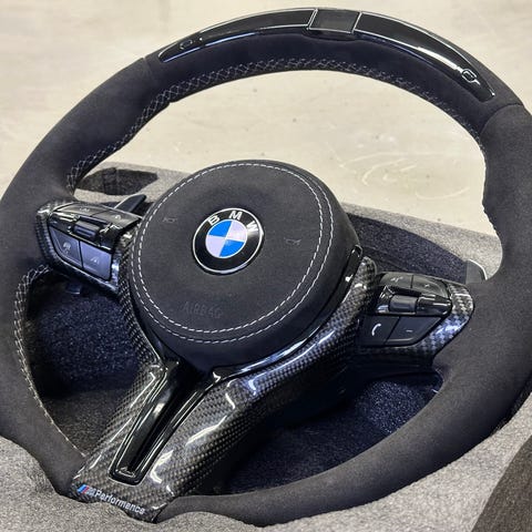 Selger et helt nytt carbonfiber ratt til mercedes w212. Denne har flat bund, alcantara sider med gul tråd. Er også carbon paddle shifters på den. Kan selges med airbag.