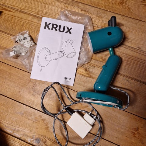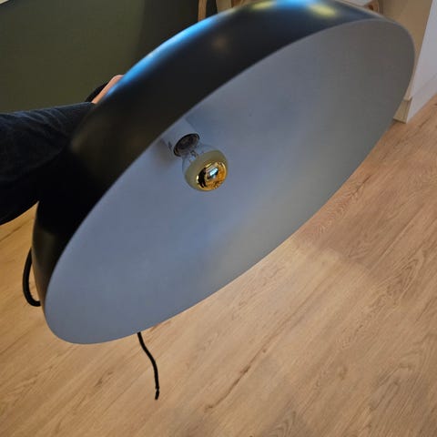 Oppheng er uoriginalt da vi det ikke fulgte med når vi kjøpte den. Opphenget består av vinkelbeslag som skrus i taket så boltes lampa fast i beslagene.