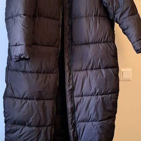 Jakken er laget av dun og gir isolasjon og varmer godt på kalde dager.