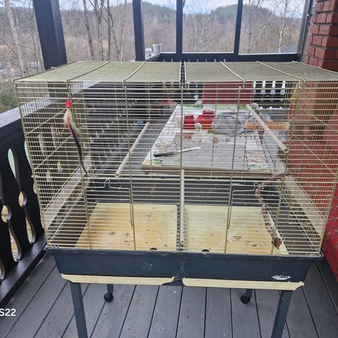 Sett med tre fuglebur med metallgitter og et hvitt fuglebur med metallgitter. Fugleburene har ulike størrelser og design, egnet for små fugler. Materialer inkluderer tre og metall, med farger i naturlig tre og hvitt.1000 kr 3stek
