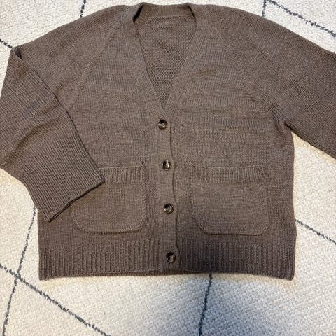 Pent brukt champagne cardigan strikket i Peer Gynt og silk mohair i str M/L selges da den ikke blir nok brukt.