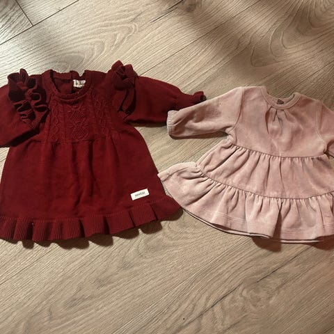 Selger en nydelig pakke med 3 kjoler til baby jente, størrelse 56, i svært god stand. Alle kjolene er som nye, uten flekker, hull eller slitasje.