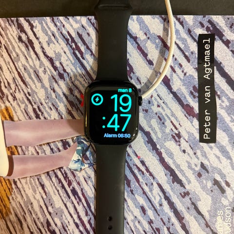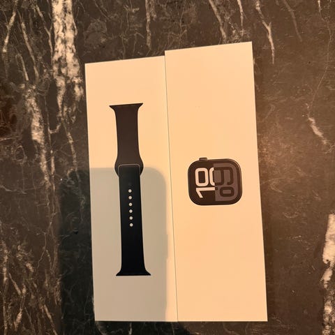 Pent brukt Apple Watch Series 10 selges med lader og sort sportsband i str. M/L