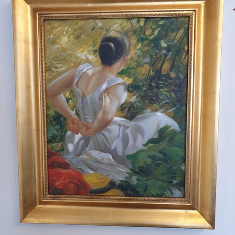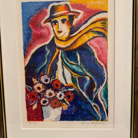 Zamy Steynovitz kunsttrykk i farger med motiv av en kvinne omgitt av blomster. Nummerert 70 av 275 eksemplarer. Signert av kunstneren. Selges med rammen.