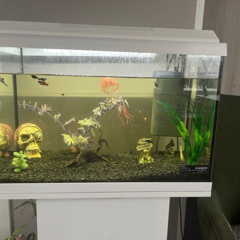 Akvarium med tilhørende skap og integrert belysning. Inneholder dekor og flere fisker. Passer til bruk som innendørs akvarium for oppdrett og visning av ferskvannsfisk. 180 L