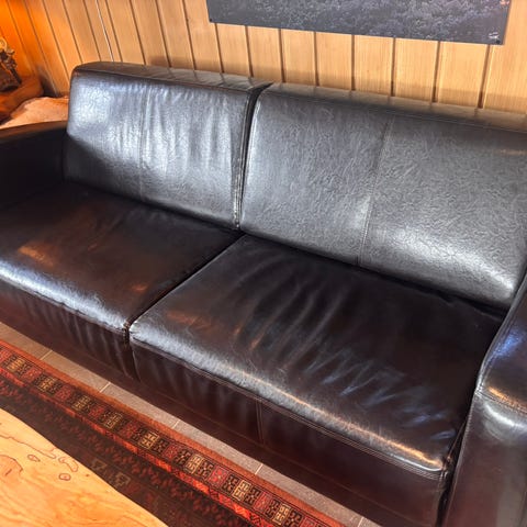 Sofa i skinnimmitasjo men noen synlige bruksmerker på ene ermet.