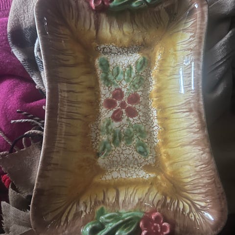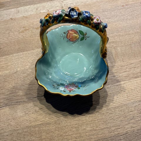 Dekorativ keramikkand med blått og hvitt mønster. Keramikkfiguren består av to deler, en and og en base med blomsterdekor. Kan brukes som dekorasjon eller oppbevaringskar.