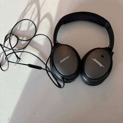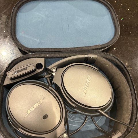 Bose hodetelefoner med medfølgende etui og kabel. Hodetelefonene har over-ear design med polstrede øreputer. Etuiet er hardt og beskytter hodetelefonene under oppbevaring eller transport. Kabelen følger med for lading.