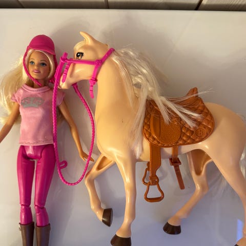Barbie Enhjørning og Hest lekedyr i plast med detaljer i rosa og blått. Begge har langt hår som kan børstes. Passer for barn som liker fantasifull lek.