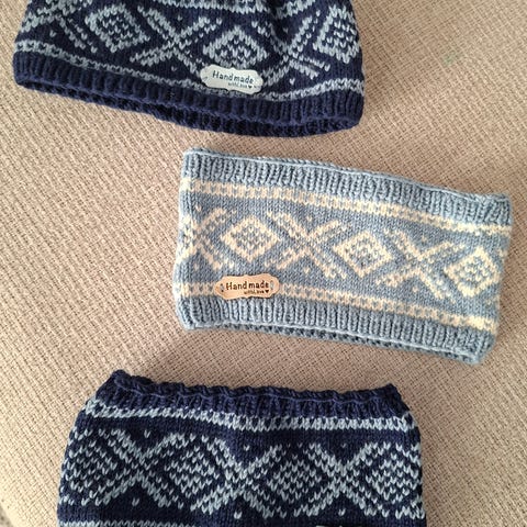 Selger pent pannebånd med Marius mønster. Pannebåndet er foret med fleesstoff.