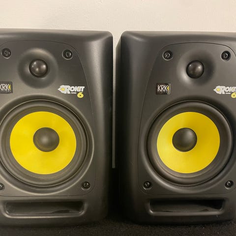 KRK Rokit 6SE studiomonitor med hvitt kabinettdesign. Har brukt de i mange år som lydmonitor i studio og de låter fortsatt fint.