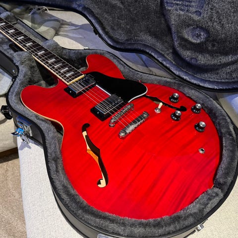 Selger en 2025 utgave av Epiphone Les Paul Standard Reissue 1959 inspired by Gibson Custom shop i Deep Red Sunburst Gitaren er mer eller mindre strøken. Jeg kjøpte den av en på finn.no rett for jul 2025. Skiftet strenger (DAddario 10-46) og mer eller mindre kun testet av meg. Fungerer som den skal, men jeg holder meg stort sett til min Telecaster.