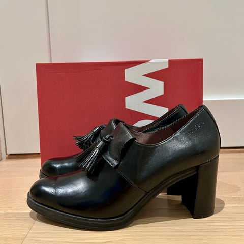 Wonders støvler i størrelse 38, svart farge. Støvlene har en høyde som går opp til leggen og en lav blokkhæl. Ekstra bredde. Materialet er glatt og gir et klassisk utseende.