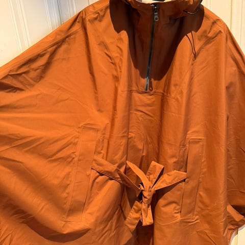 Ubrukt. Regnponcho med ermer og hette. Vanntette glidelåser i lomme. Regulerbar snor rundt hette. Refleks-detaljer. Lett å slenge på seg over andre plagg.