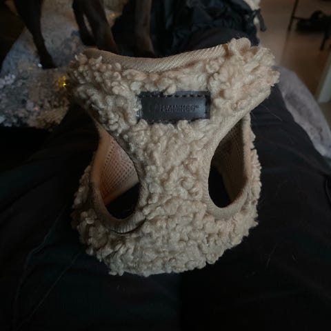 Plumjam hundedekken i grønn og beige fleece. Dekkenet har knappelukking under, str XS
