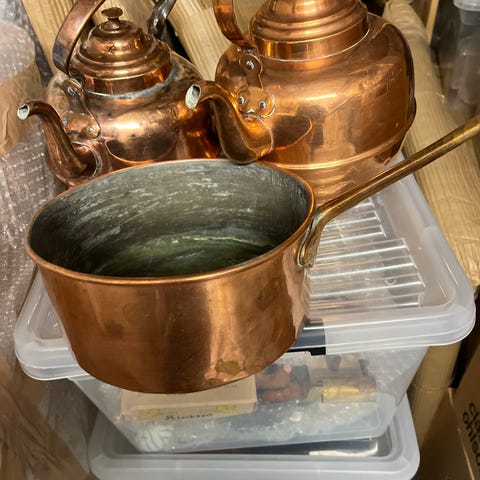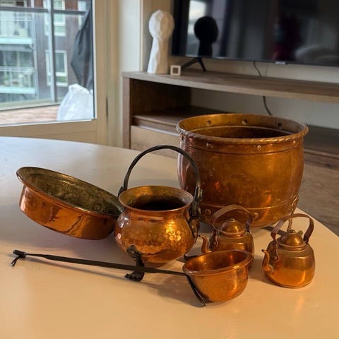 Består av liten håndhamret kobberskål og liten kobberbøtte med messinghank.