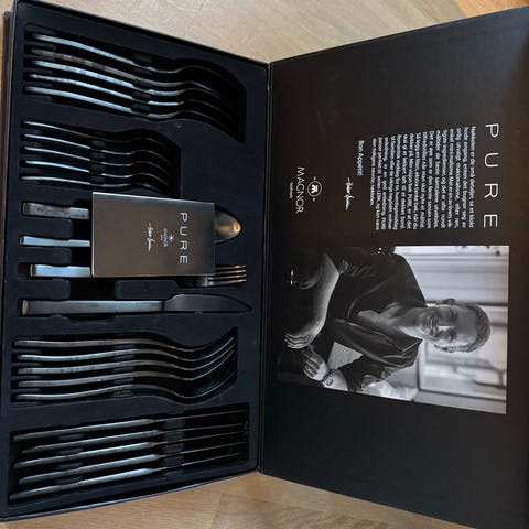Magnor Glassverk Pure bestikksett med 4 deler. Settet inkluderer kniv, gaffel, stor skje og liten skje. Designet med blankt metall og rett, moderne form.