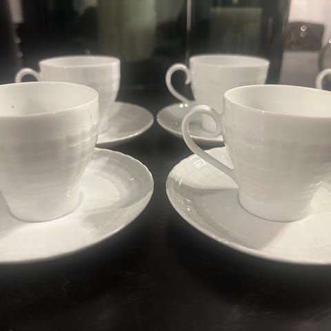 Dette er Hutschenreuther Maria Theresia mokka kaffekopper og skåler i hvitt porselen. Serviset er kjent for sin klassiske, elegante stil med bølgete, utskårne kanter.