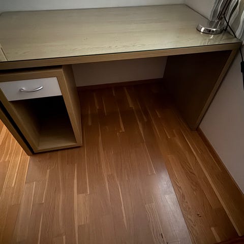 Glassplate som er enkel å holde ren. Praktisk hylle under bordflaten.