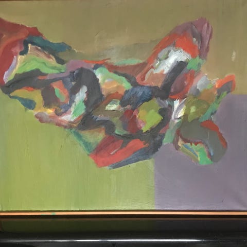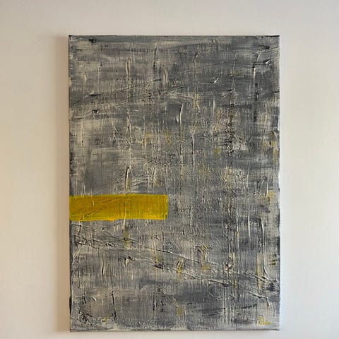Maleri med abstrakt motiv i grå farger.