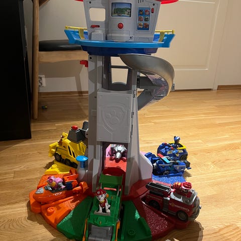 Paw Patrol lekesett som inkluderer et tårn med spiralrutsjebane og flere kjøretøy i plast. Settet har flere etasjer med ulike aktivitetsområder og er designet for barn. Passer til innendørs ek og rollelek.