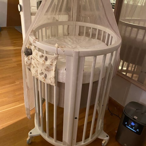 Svært lite brukt. Høydejusterbar bedside crib med hjul. Nedfellbar side. Luftige mesh-paneler rundt liggedelen