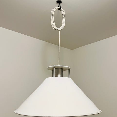 Den er laget i hvitlakkert metall, har heis/nedtrekksfunksjon, er merket og har en del elementer som gjør at den minner om klassikeren PH5.