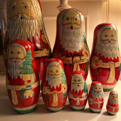 Matryoshka eller Babuska dukke med 8 dukker i vakre farger hele og fine. Tre. Stemplet under og ligger med en lapp. Heter Matpellika og står 8 deler. Vil tro den er fra 70 tallet. Den største har høyde 1616 cm og bunnen er diameter 6 cm. Den minste er 1,5cm høy.