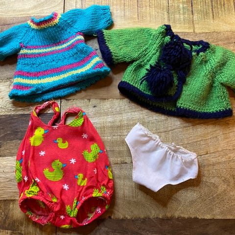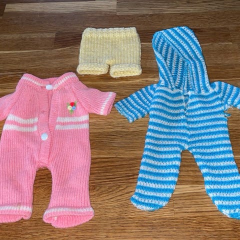 Dukkeklærne ble sydd til en dukke av celluloid. Dukken med disse klærne har alltid stått til pynt. Dukken var mer en 50 cm lang.