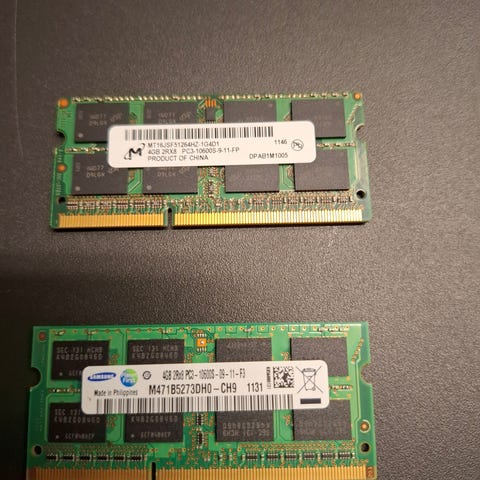 2 Crucial 4GB DDR4-2400 UDIMM RAM-minne moduler i standard størrelse for bruk i datamaskiner. Moduler med synlige minnebrikker og kontaktpunkter for installasjon i kompatible hovedkort. Selges for 500 kr hver. Kan kjøpes separat eller samlet for 950 kr.