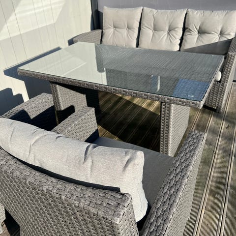 Sofagruppe i håndflettet grå, kunstrotting av polyetylen med pulverlakkert stålramme.
