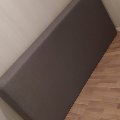 Blåmønstret rammemadrass med tynn overmadrass. Må hentes