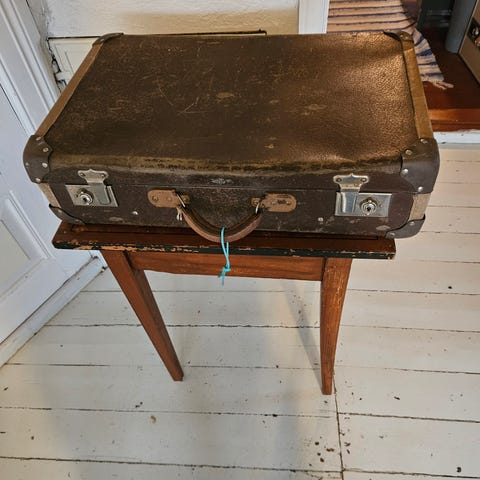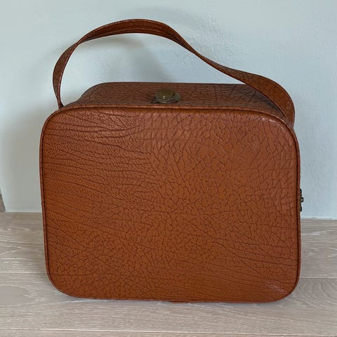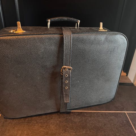 Vintage koffert, muligens laget av lær, med messingfargede metallåser, men mangler nøkkel.
