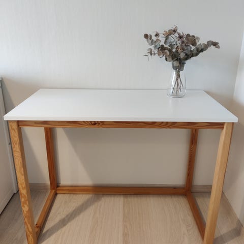 Skrivebord med svart bordplate til salgs. Som nytt, bortsett fra det har noen små rustflekker (fra lampe?) på venstre side. Se bilde 3. Det er hull til å ha ledninger gjennom bilde 4.
