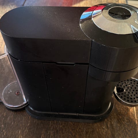 Nespresso Vertuo Plus kapselkaffemaskin i hvit farge. Maskinen bruker Nespresso-kapsler for enkel tilberedning av kaffe. Kompakt design med vannbeholder bak, egnet for hjemmebruk.