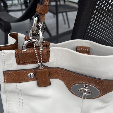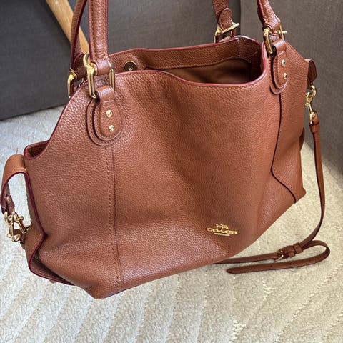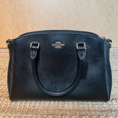 Coach veske i svart skinn. Vesken har gullfargede detaljer og glidelås, med håndtak og avtagbar skulderrem. Laget av ekte lær med solid bunn med metallføtter.