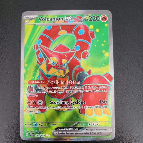 Pokémon Volcanion EX samleobjekt kort med holografisk design. Kortet viser Volcanion med angrepet Volcanic Heat og har 180 HP. Koraidon sleave medfølger også.