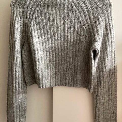 Selger en kjempefin og lun grå strikkegenser med høy hals og stilige ribbestrikkede detaljer. Genseren er veldig varm og har et mykt materiale som ikke klør, noe som gjør den utrolig behagelig å ha på rett mot huden. Den har en moderne passform og er i kjempegod stand