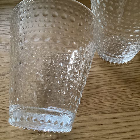 Høyden er 6,2 cm og diameteren er 5 Glassene er finsk design fra 1970-tallet.