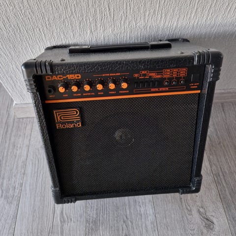 Roland Cube-15 gitarforsterker med innebygd høyttaler, 15W effekt, AC 230V strømforsyning. Utstyrt med equalizer, flere lydinnstillinger og AUX-inngang. Kompakt design med bærehåndtak.
