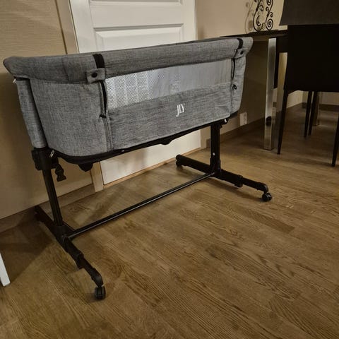 Vi selger en pent brukt bedside crib. Så vidt at babyen vårt lå opp i den, men den var en fin beskyttelse at ikke han ramlet ut av senga. Fungerte for meste som nattbord 😊.